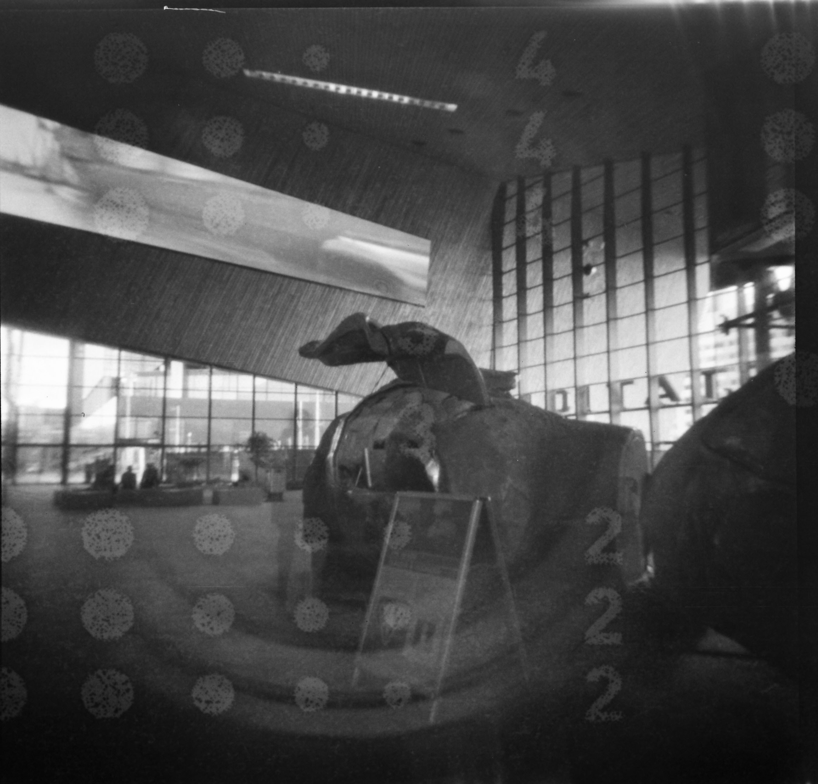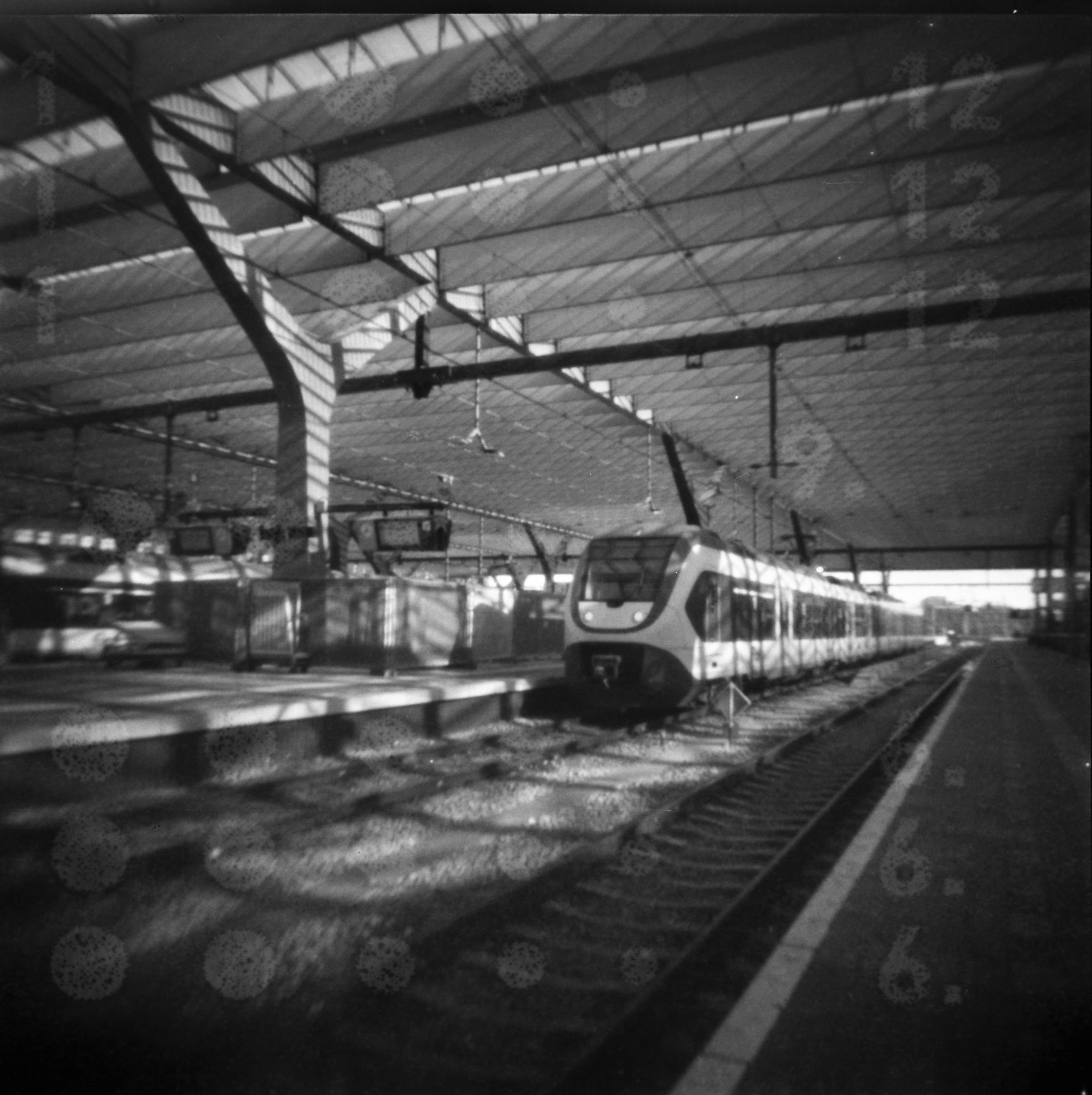 The central station in my hometown Rotterdam was recently renovated. It has been turned into an interesting building, with lots of shapes and materials. A great location to take pinhole shots, or so I thought….. With some other people, including my husband, I went there a couple of weeks ago. We set up our tripods and cameras and started shooting away. The main hall is very large and crowded most of the time; an interesting location to practice movement shots or just enjoy the architectural elements of the building.
