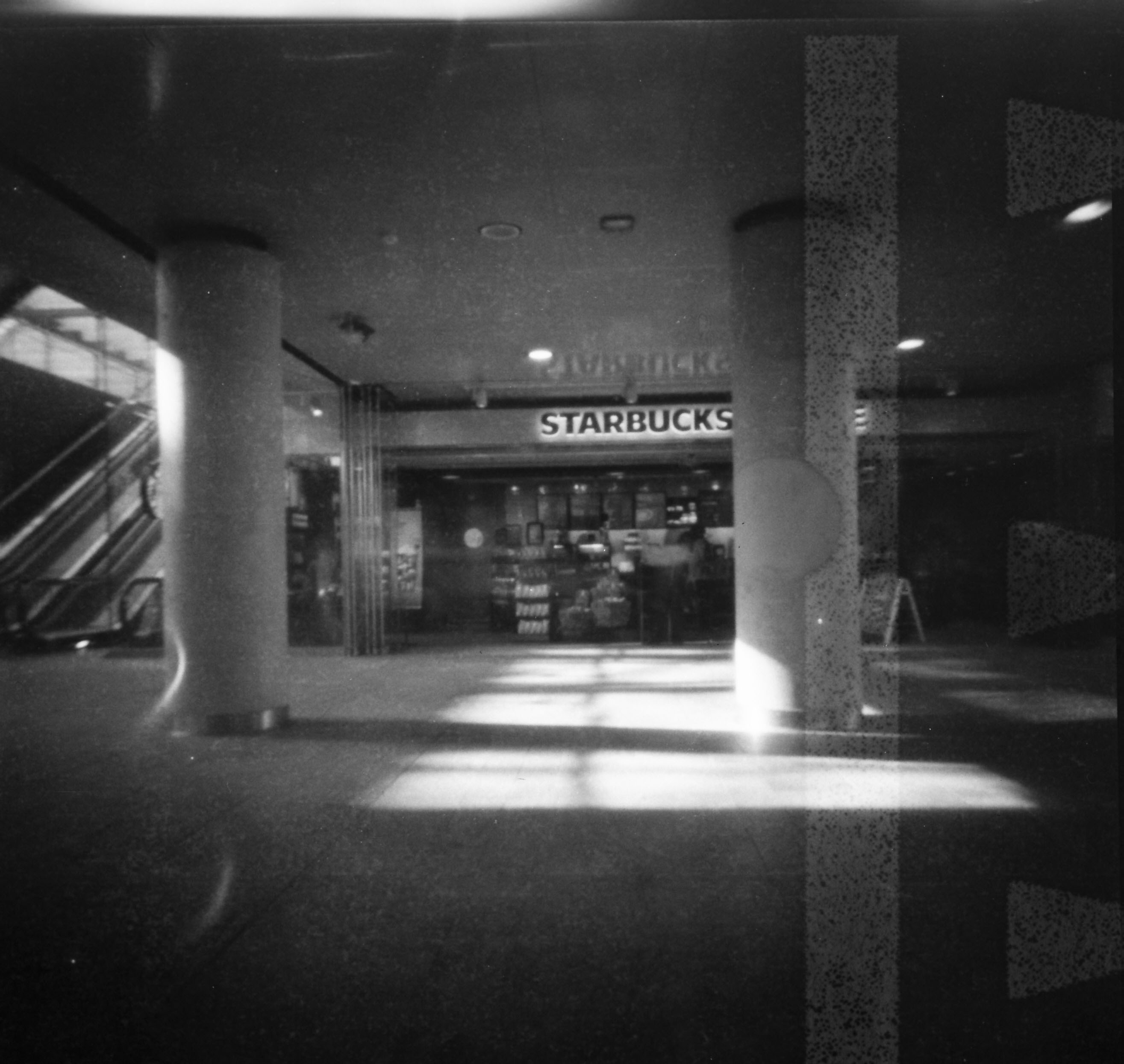 We also took shots of the trains, the platforms and the cyclists tunnel outside the station. I suggested we’d go back in and see if there was something interesting to see (shoot) near the shops. My husband set up his camera to make a pinhole shot of an elevator going up and down, and I sat on a bench and started an exposure of the local Starbucks coffee shop with people walking by. And then it happened: we got in trouble with the police… According to them, we weren’t allowed to take pictures inside the station, unless we had permission from the railway company (which we didn’t). They asked us all kinds of questions about our photography, our plans with the pictures we had taken and they wanted to see our IDs and write down our personal information “in case something would happen”. They also told us they thought our cameras looked very professional (plastic Holga and Diana pinhole cameras, yeah right!), and that they doubted our statement that we were photographing as a hobby, because “photographers normally spend time in nature, not stations”. Then we were asked to leave the station.