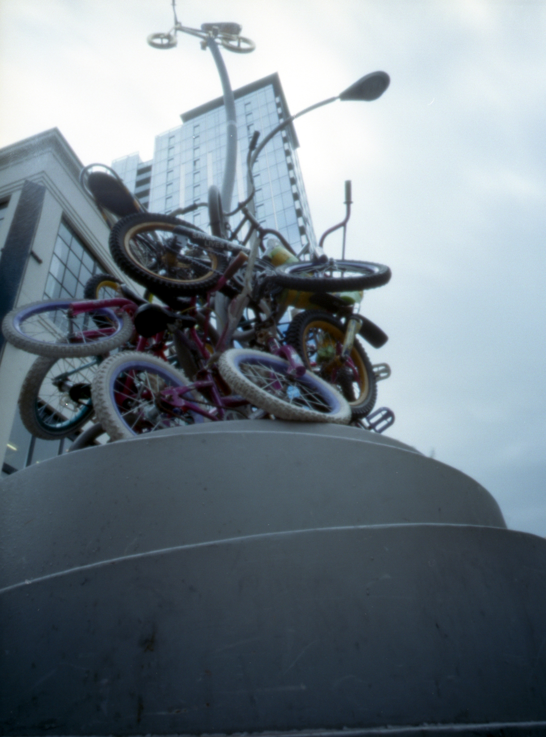 Down the street from Powell’s City Of Books in Portland, Oregon, is this odd sculpture of bikes piled on tiered concrete with a gold bike on the very tip top of a pole. It turns out that this is both a sculpture and a place where people can lock their bikes for Zoobomb.